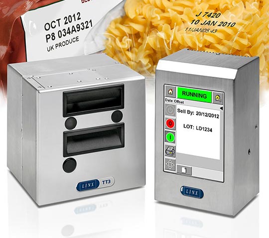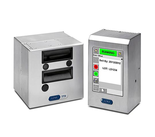 La máquina codificadora de tecnología de transferencia térmica Linx TT3, es una muy versátil impresora con un ancho de cinta de 33 mm para aplicaciones básicas de códigos de lote.
